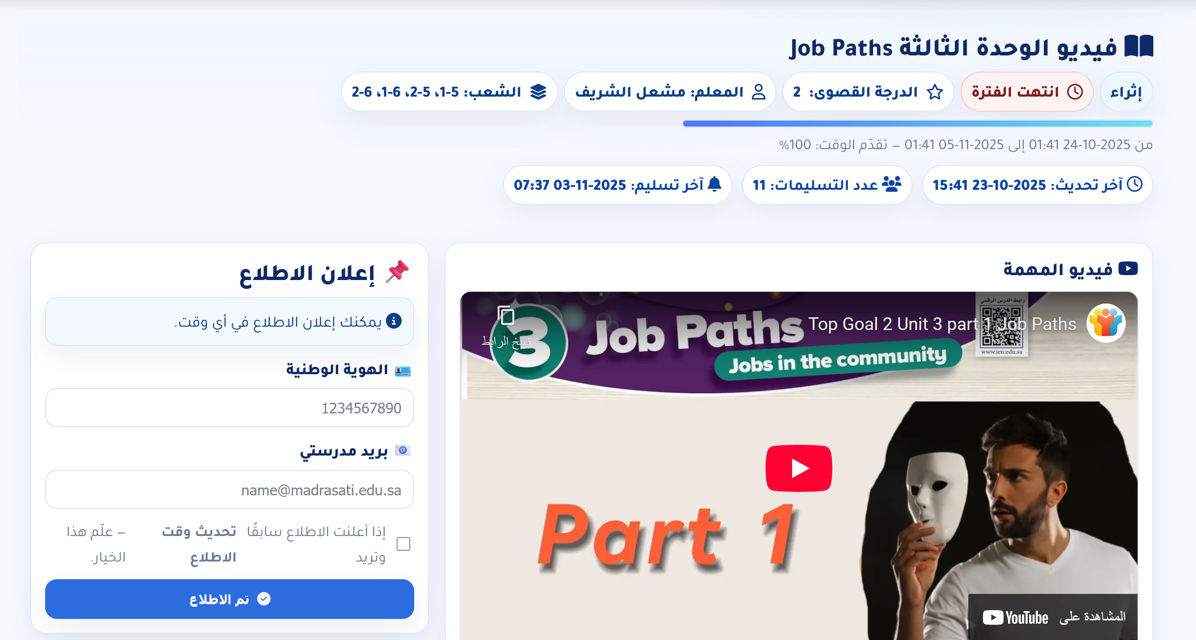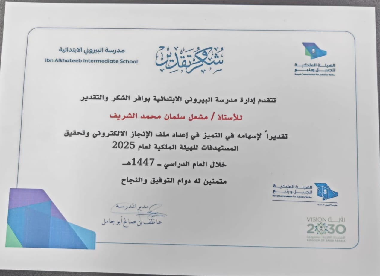 كل شاهد في هذا الملف يمثّل ممارسة مخططة ذات أثر؛ تتكامل فيها الخطة الدراسية، واستراتيجيات التدريس، وأساليب التقويم، والمتابعة الفردية ؛ للوصول إلى أعلى مستوى في سُلَّم تقييم أداء المعلم.